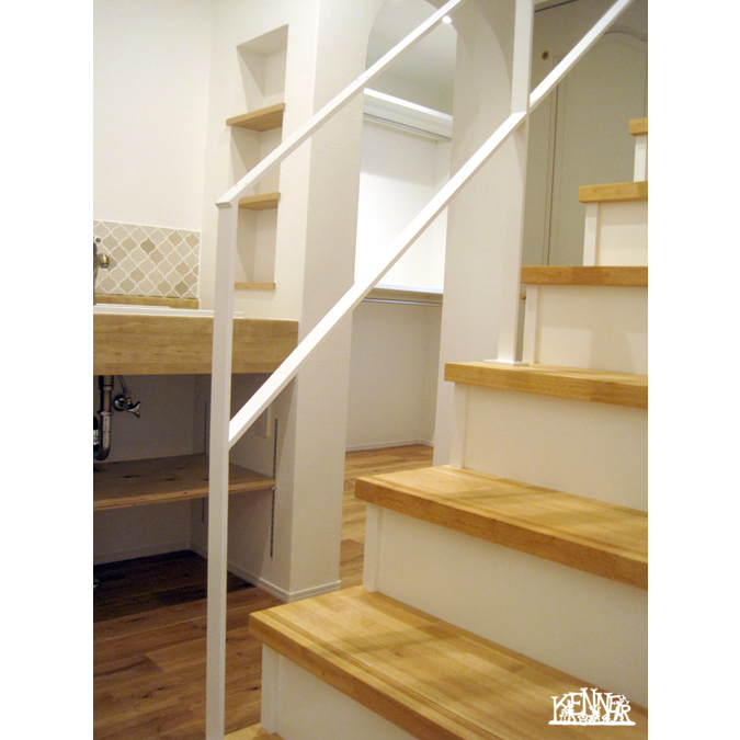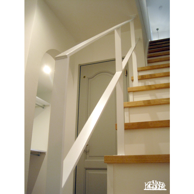 シンプルなデザインの階段手すり。爽やかなホワイトカラーが印象的です。