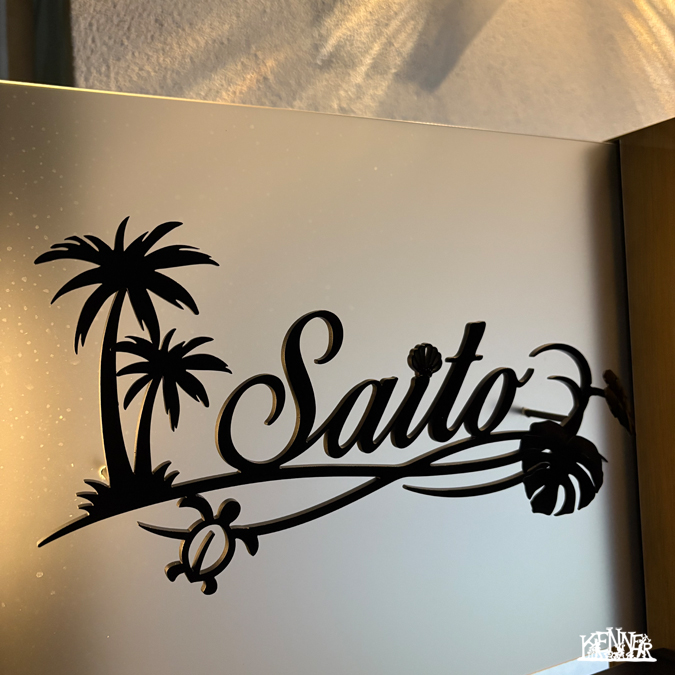 ヤシの木×波×モンステラ×ホヌ×貝をモチーフにしたハワイアン表札。